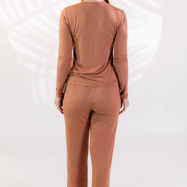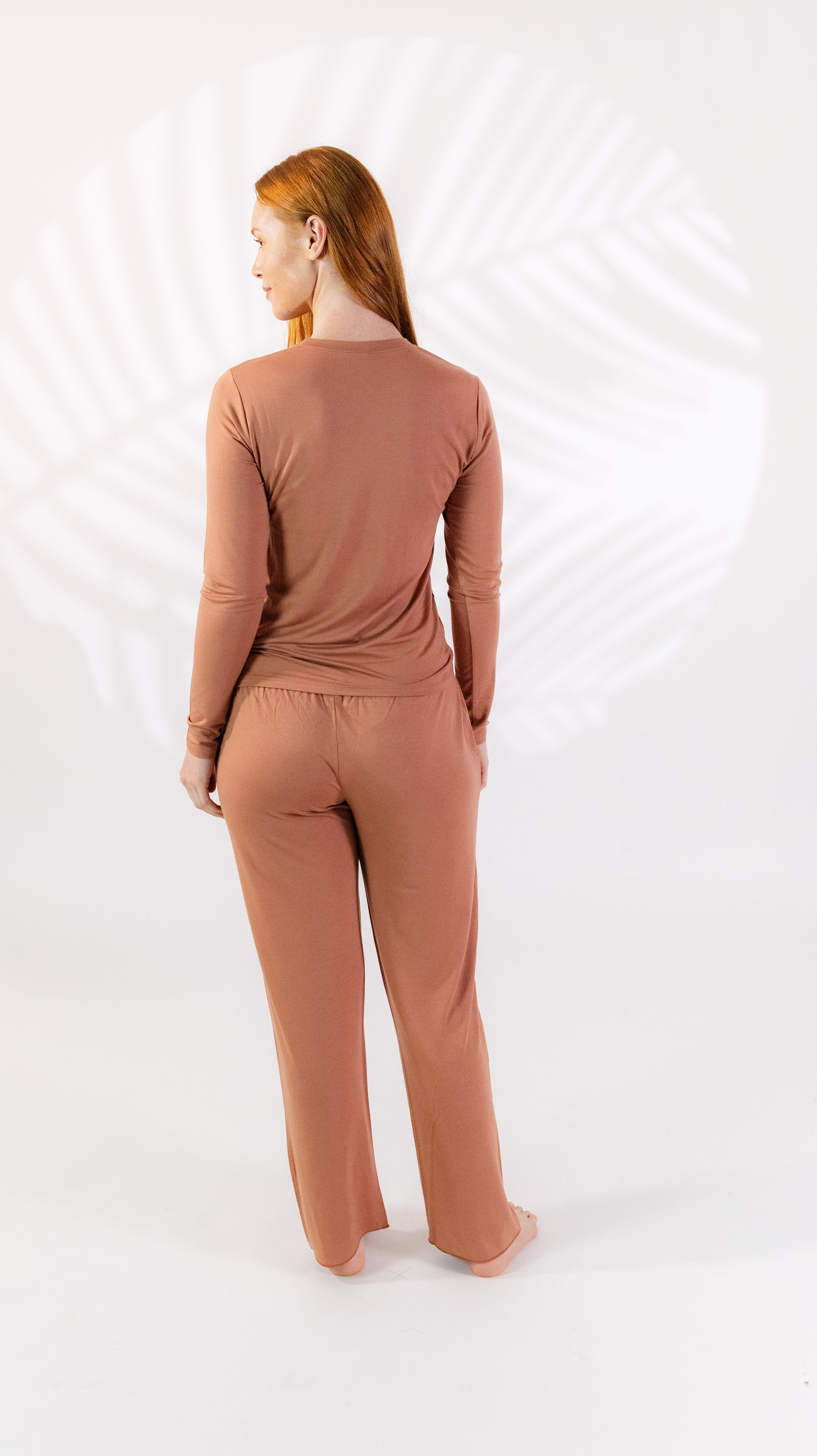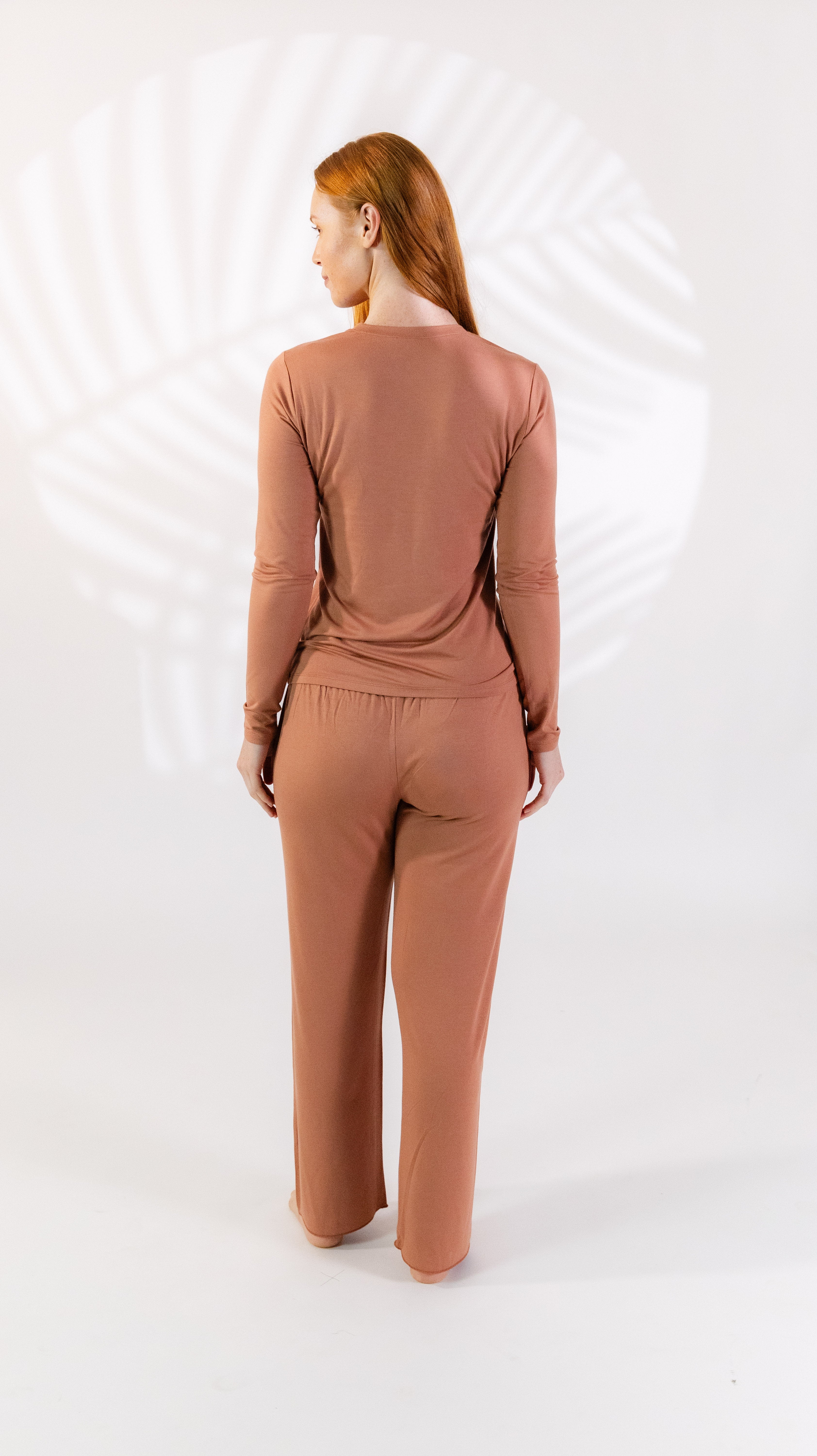 A classic must have. Our women's long sleeve round neck tee is the perfect addition to your loungewear collection. Crafted from luxurious modal fabric, this tee combines comfort, style, and versatility for your ultimate relaxation. Featuring a classic round neck design, this tee offers a timeless look that can be easily paired with your favorite bottoms. The long sleeves provide extra coverage and warmth, making it ideal for cooler days or cozy nights in. Designed with lounging in mind, this tee is perfect for unwinding at home, running errands, or even casual outings. Pair it with your go-to lounge pants, leggings or jeans for a relaxed and effortless look that exudes comfort and style.