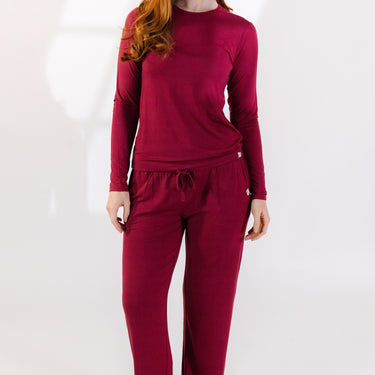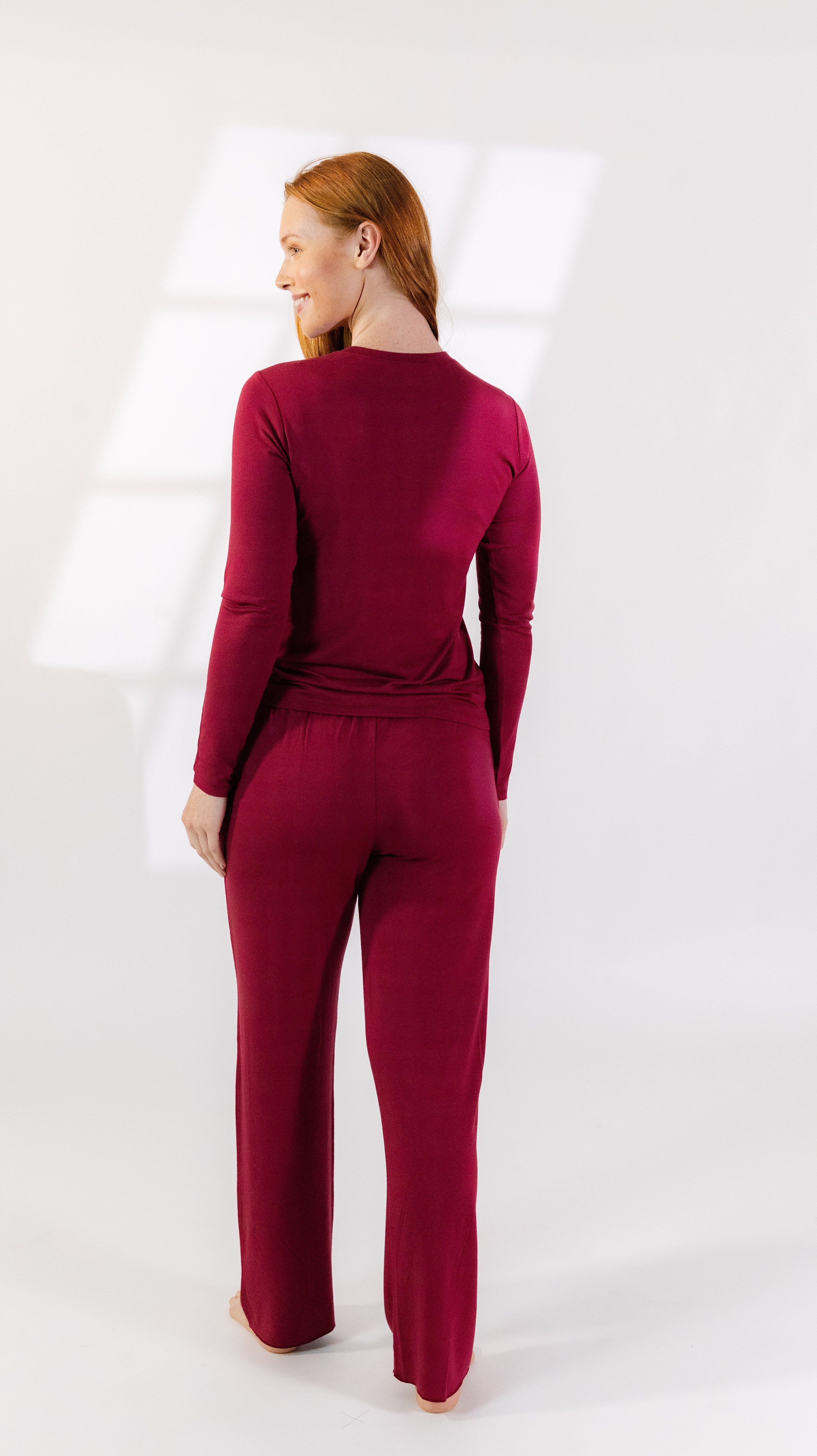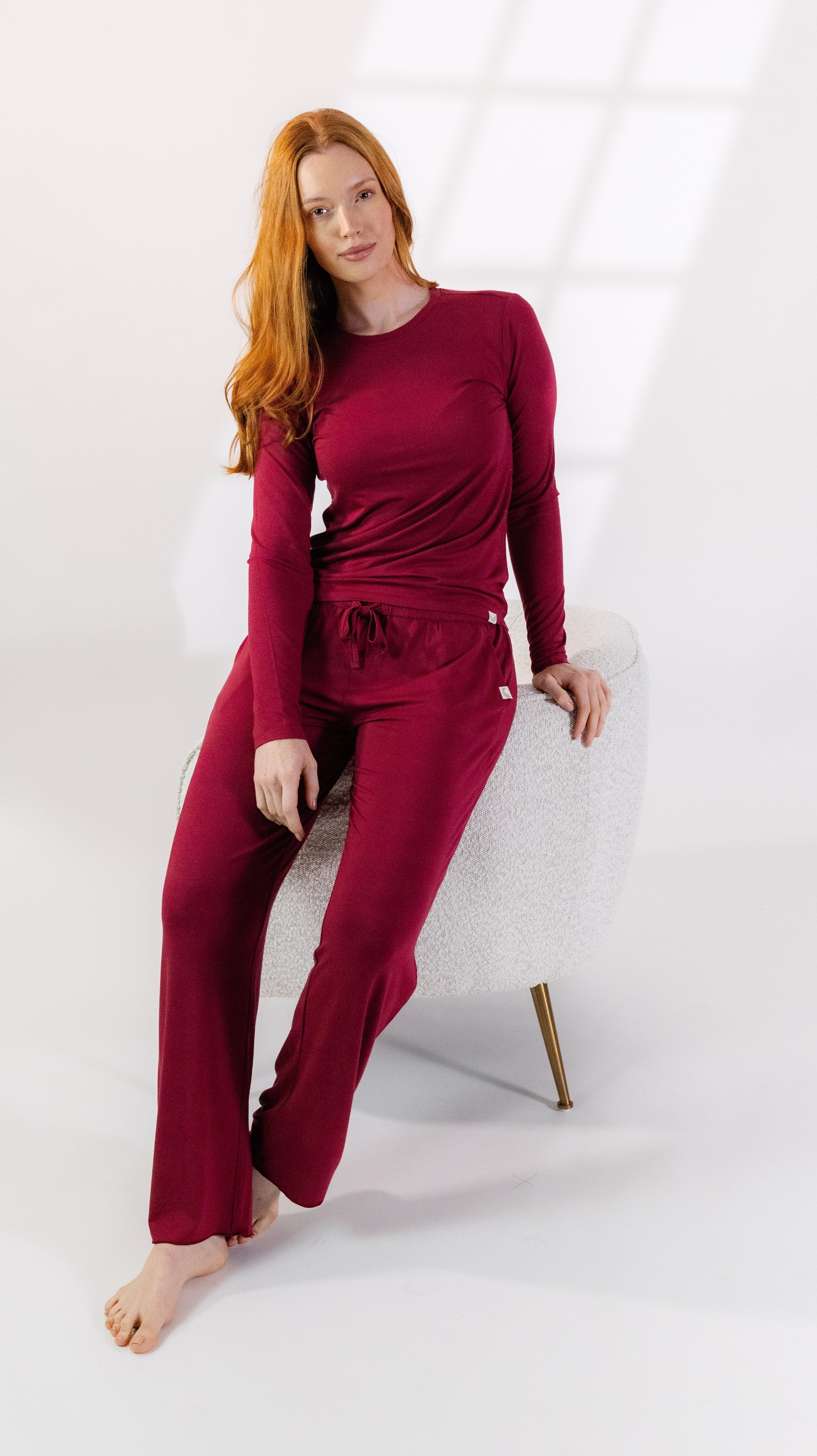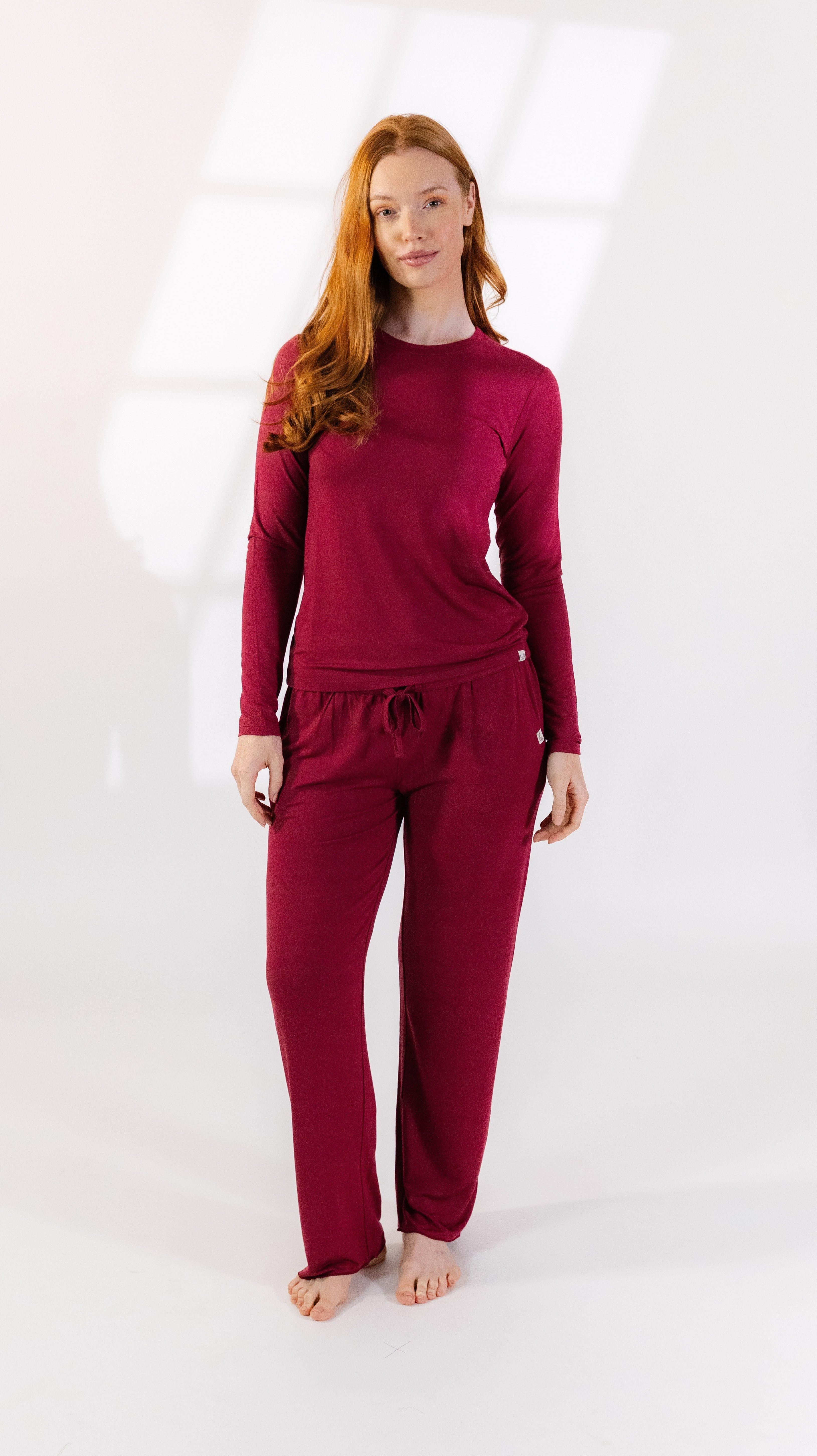 A classic must have. Our women's long sleeve round neck tee is the perfect addition to your loungewear collection. Crafted from luxurious modal fabric, this tee combines comfort, style, and versatility for your ultimate relaxation. Featuring a classic round neck design, this tee offers a timeless look that can be easily paired with your favorite bottoms. The long sleeves provide extra coverage and warmth, making it ideal for cooler days or cozy nights in. Designed with lounging in mind, this tee is perfect for unwinding at home, running errands, or even casual outings. Pair it with your go-to lounge pants, leggings or jeans for a relaxed and effortless look that exudes comfort and style.