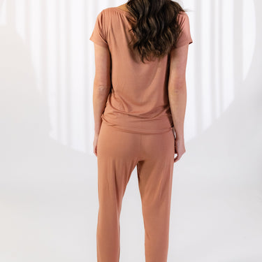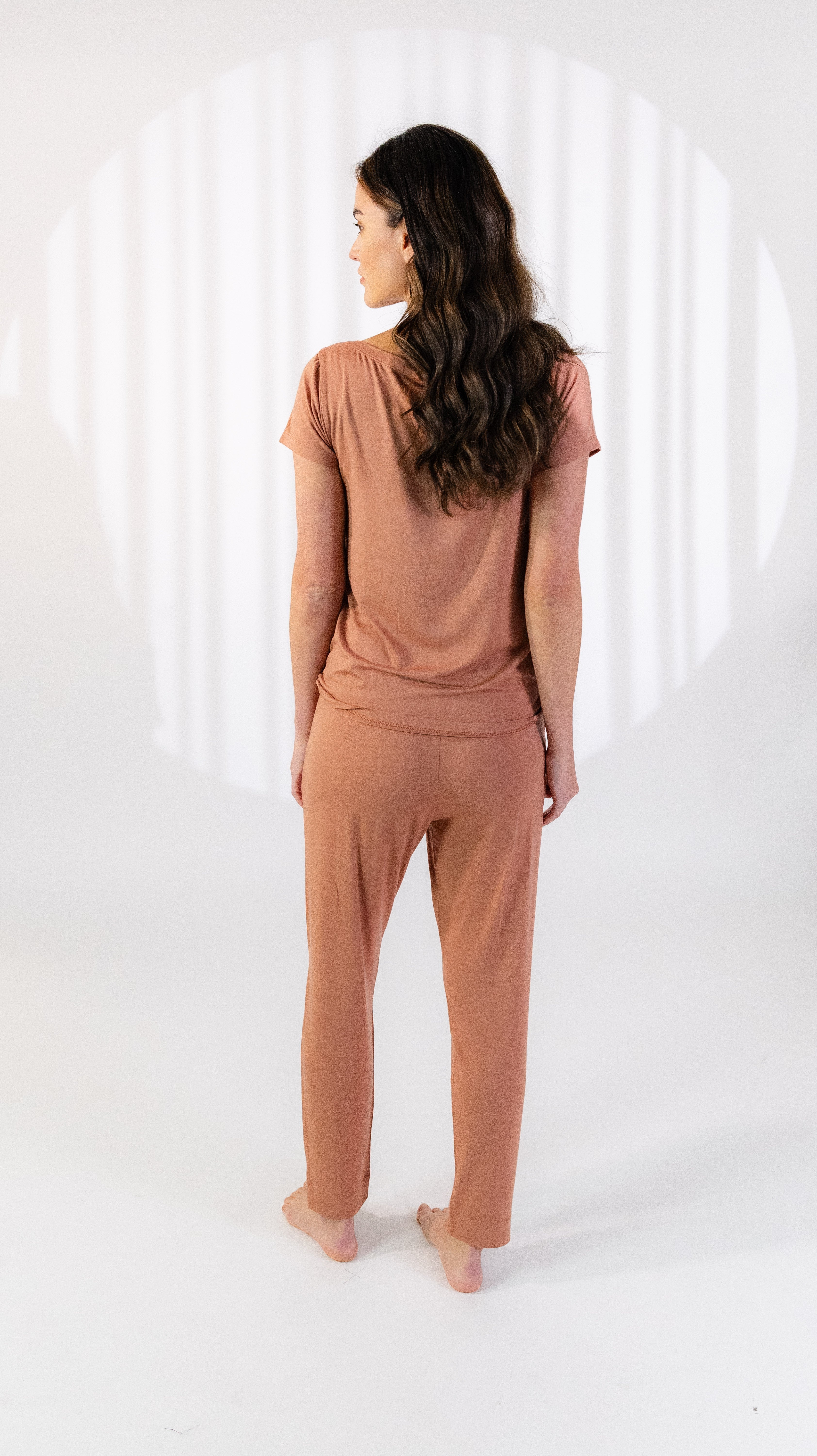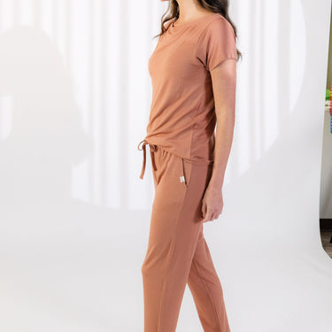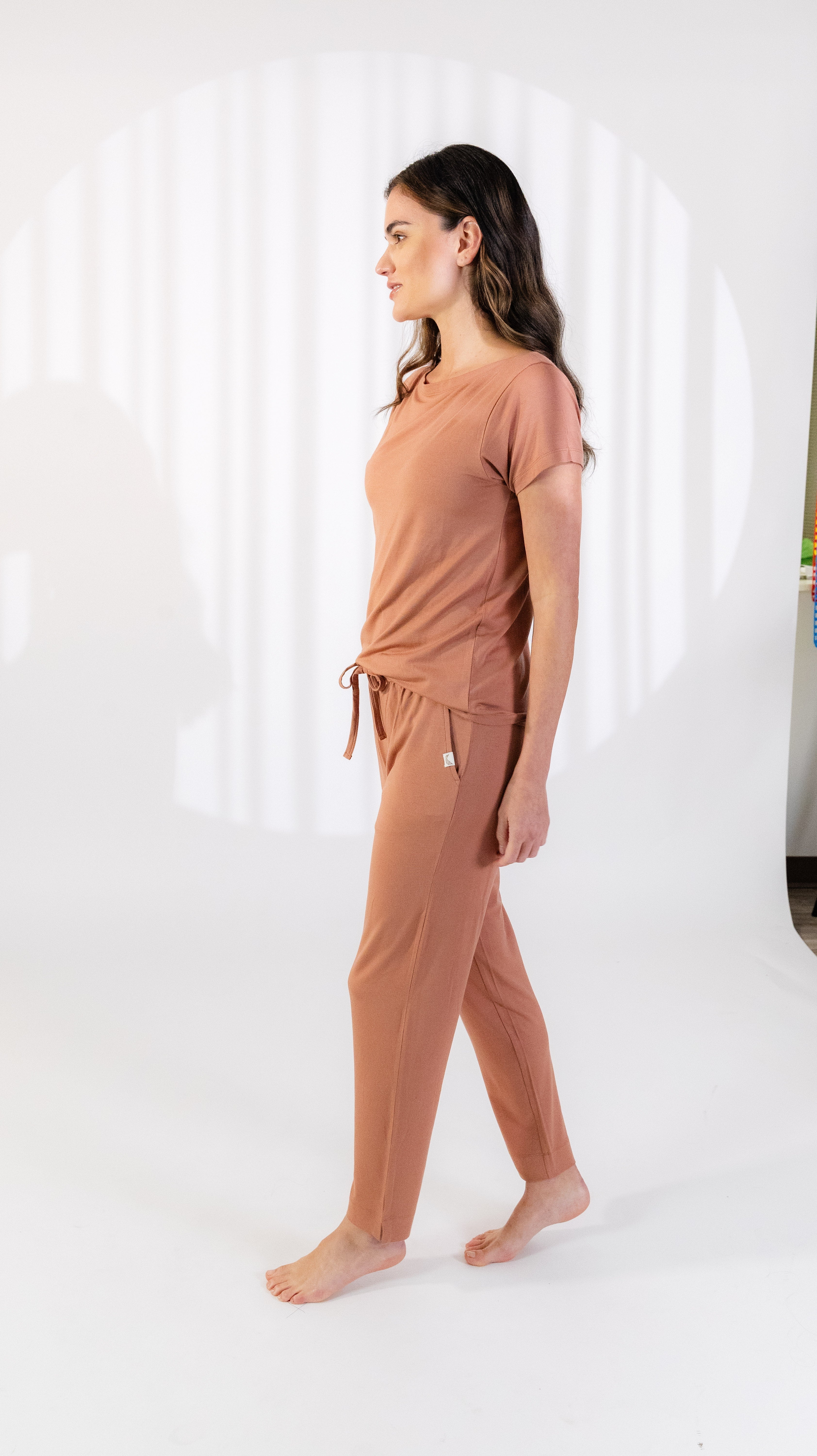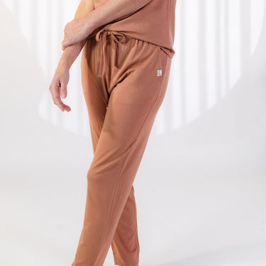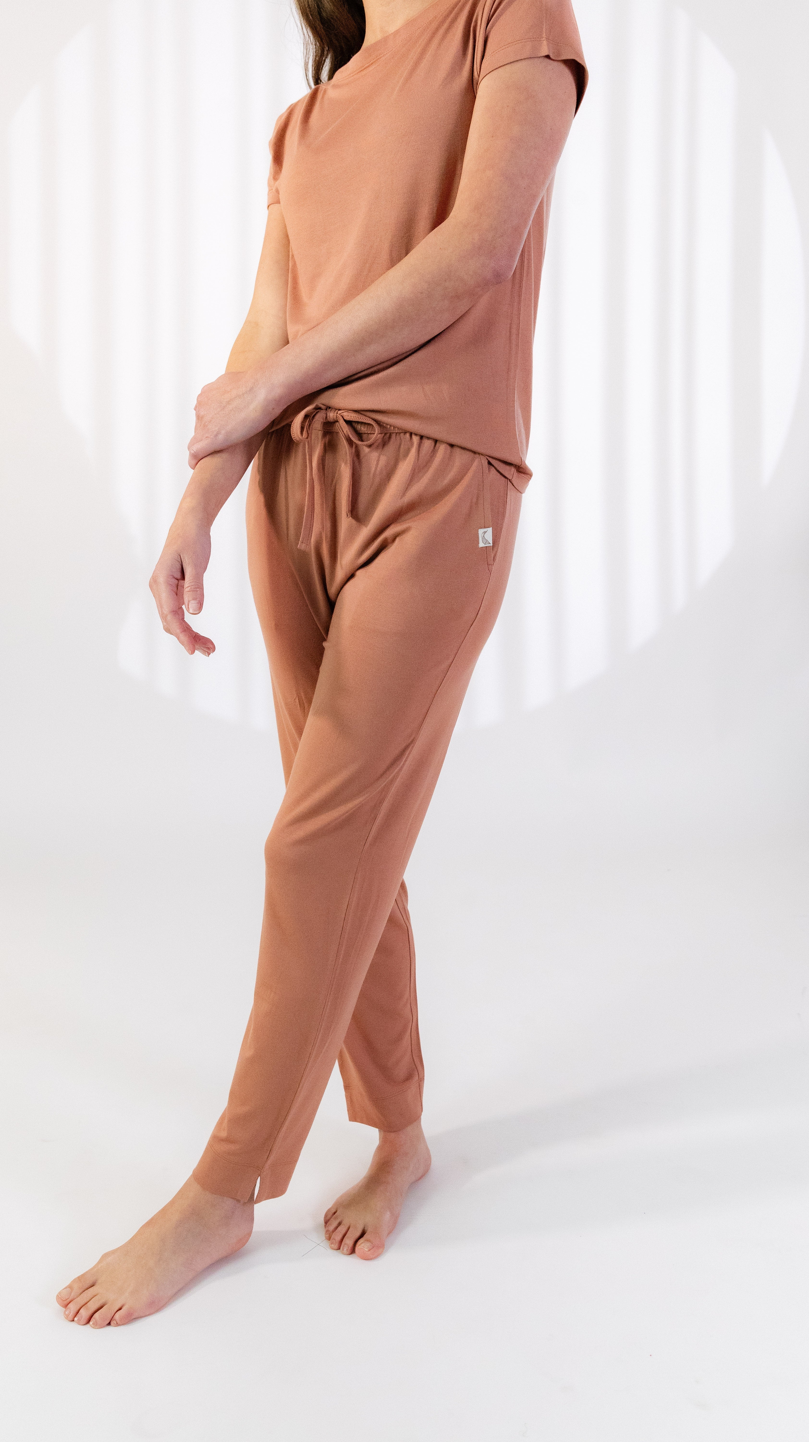 Our women's loungewear tapered long pants are designed to offer both comfort and style for your everyday relaxation. These pants are made from modal with a waistband and pockets, adding functionality to your loungewear collection. The tapered silhouette of these pants creates a modern and flattering look. They are designed to provide a comfortable fit around the waist and hips, gradually narrowing down towards the ankles. This design not only enhances your overall appearance but also allows for ease of movement. Featuring a one-and-a-half-inch waistband, with drawstring, these pants offer an adjustable fit to suit your preference. The waistband, with drawstring ensures a secure and comfortable hold, preventing any discomfort or slippage while you go about your day. Whether you are lounging at home or running errands, these pants will keep you feeling relaxed and supported.