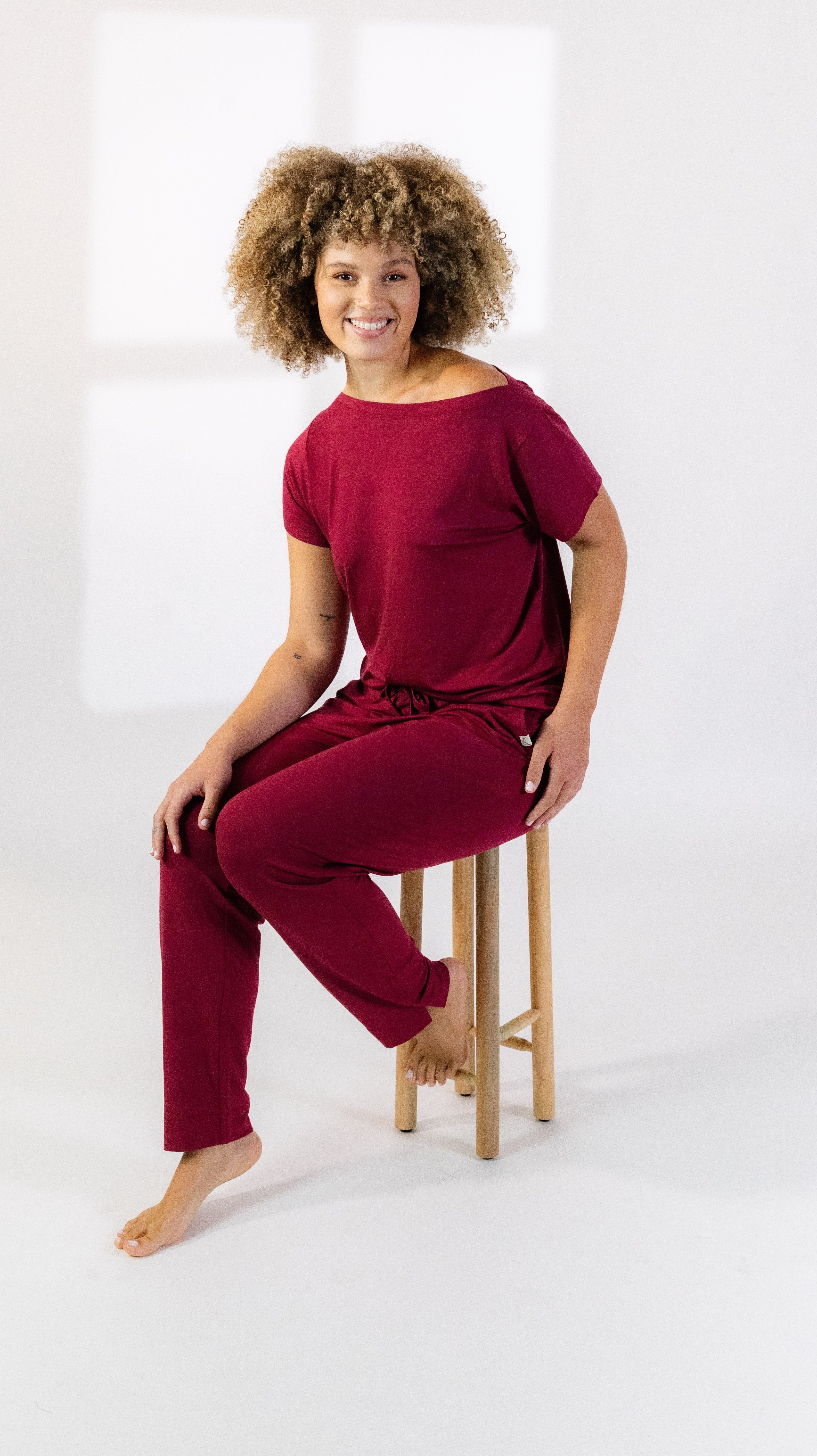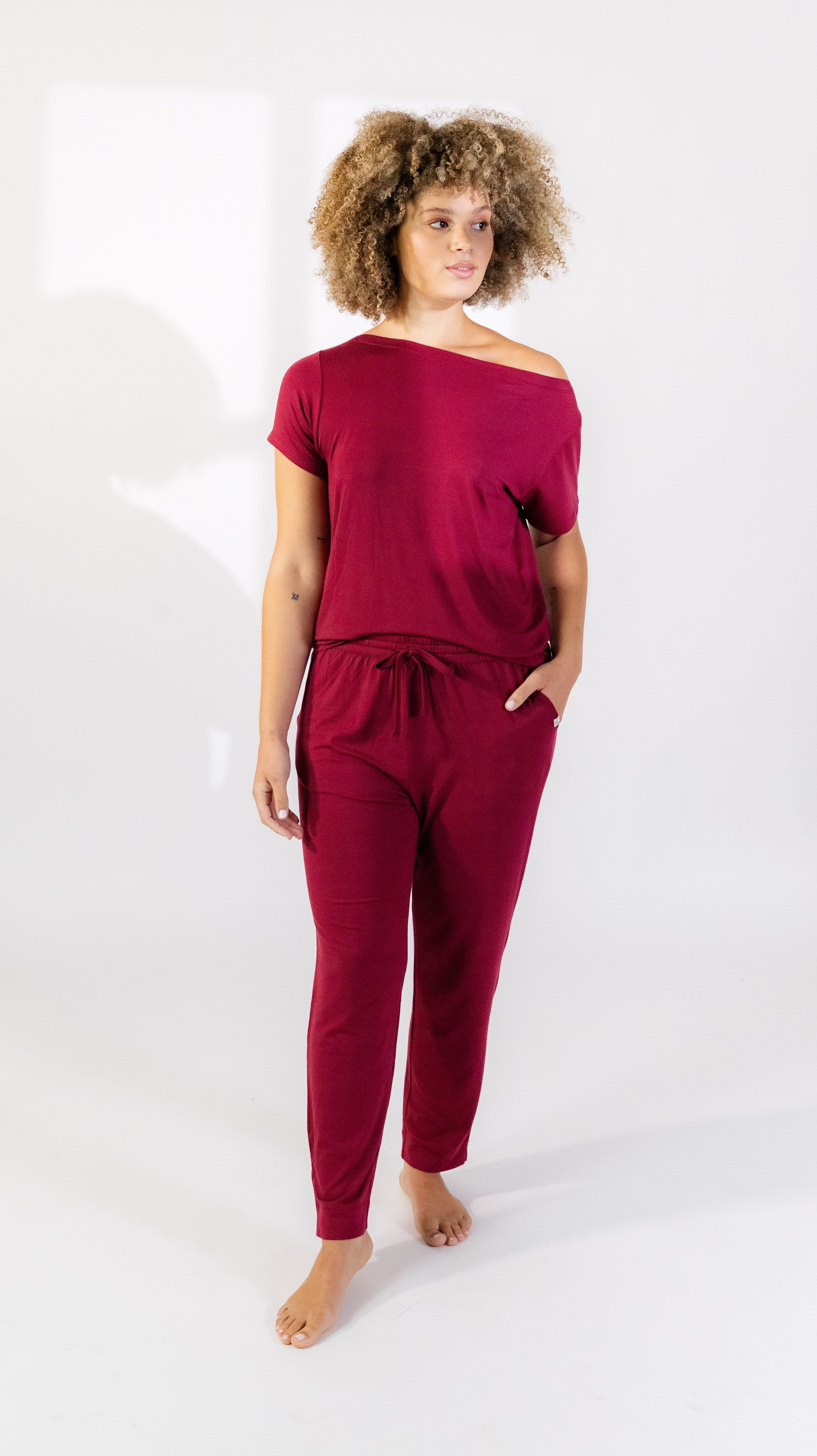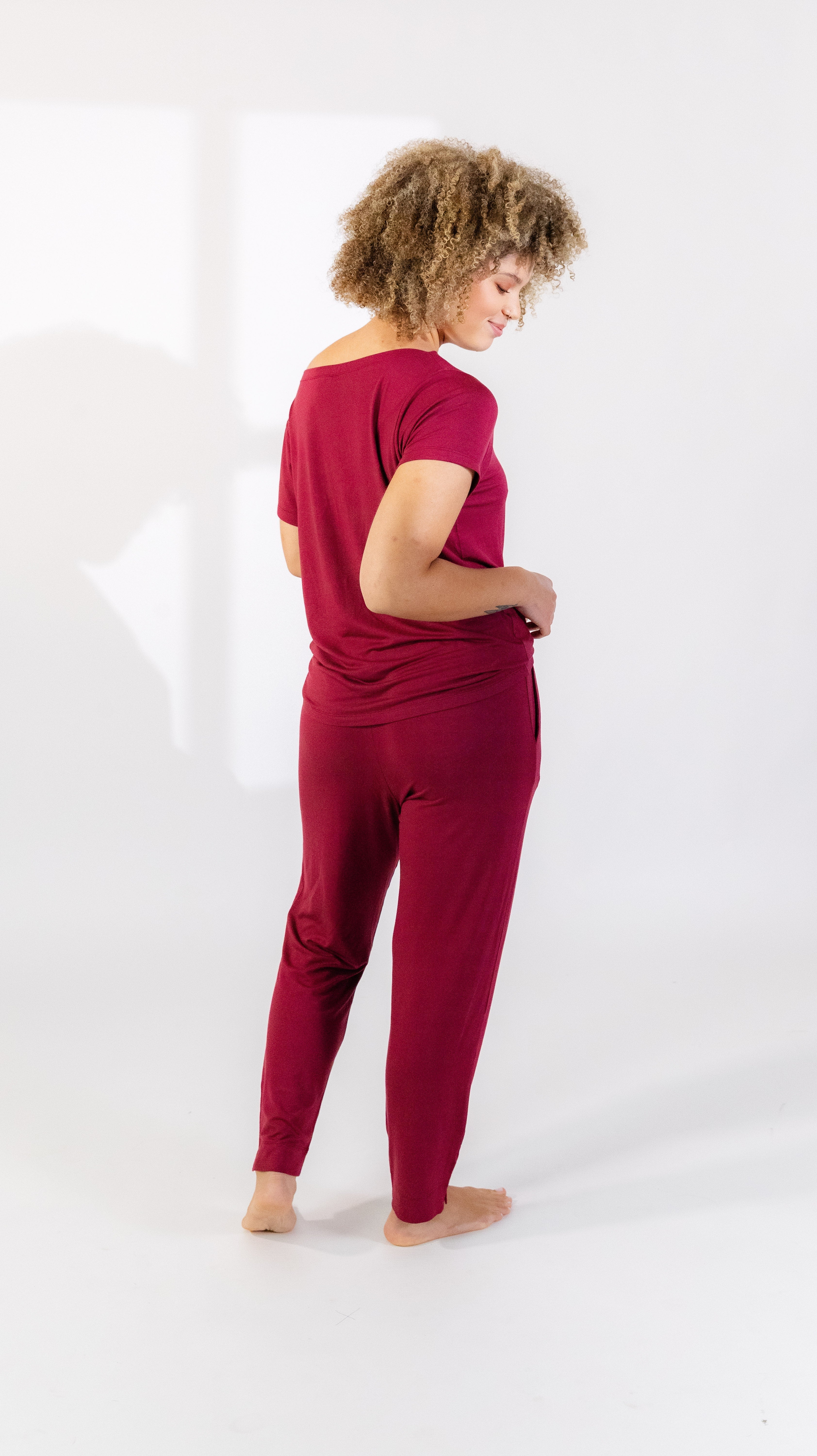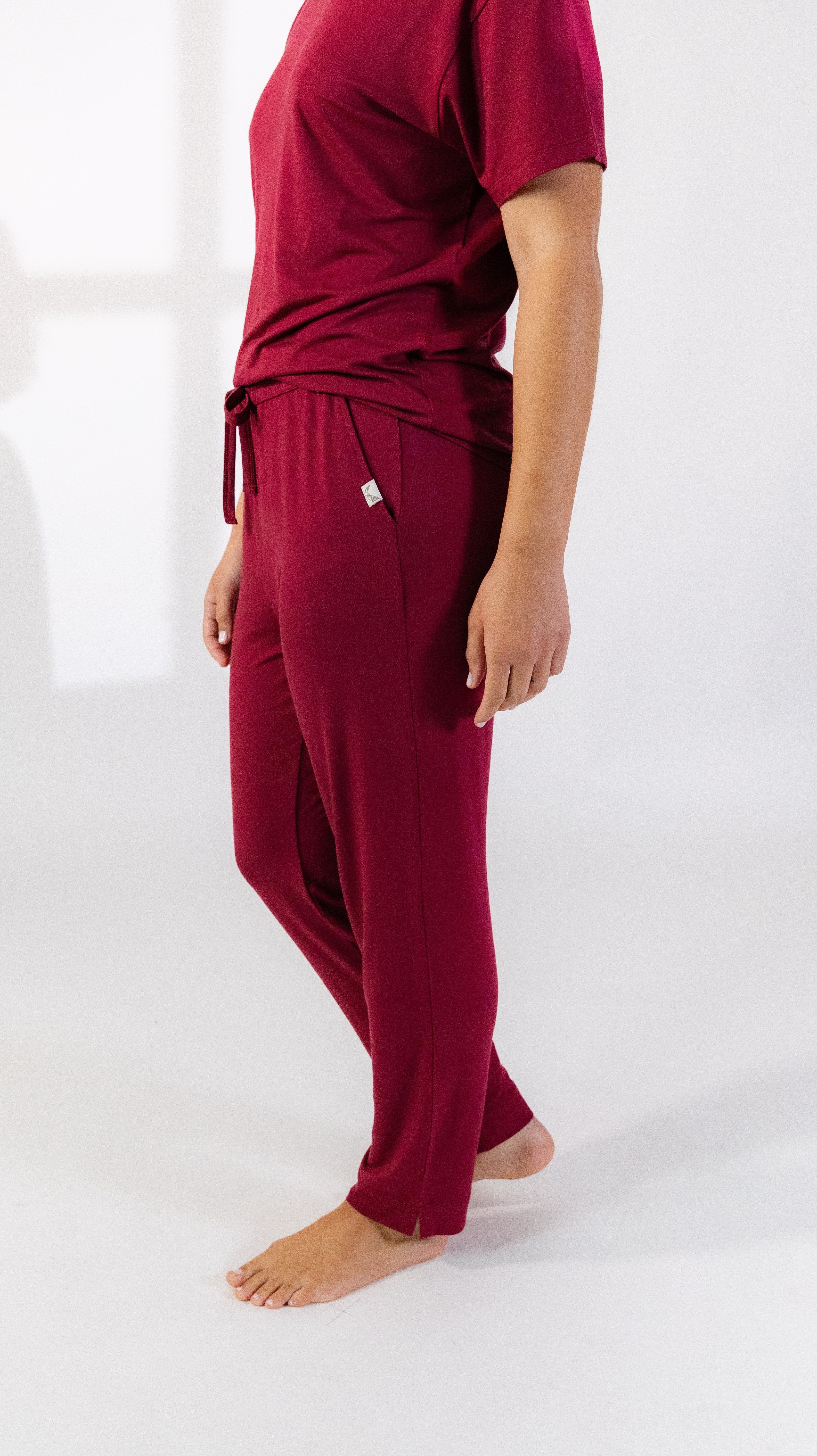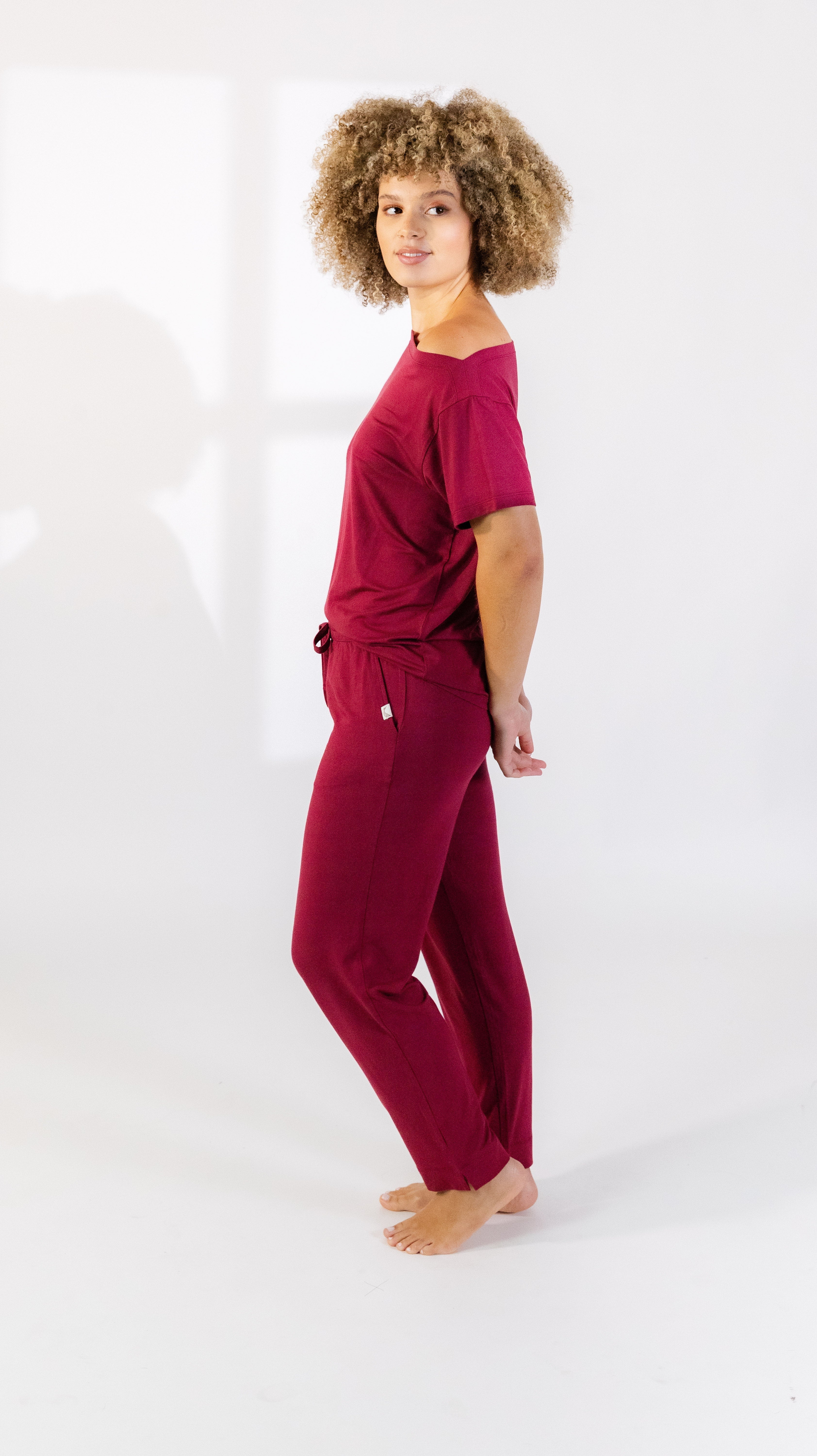 Our women's loungewear tapered long pants are designed to offer both comfort and style for your everyday relaxation. These pants are made from modal with a waistband and pockets, adding functionality to your loungewear collection. The tapered silhouette of these pants creates a modern and flattering look. They are designed to provide a comfortable fit around the waist and hips, gradually narrowing down towards the ankles. This design not only enhances your overall appearance but also allows for ease of movement. Featuring a one-and-a-half-inch waistband, with drawstring, these pants offer an adjustable fit to suit your preference. The waistband, with drawstring ensures a secure and comfortable hold, preventing any discomfort or slippage while you go about your day. Whether you are lounging at home or running errands, these pants will keep you feeling relaxed and supported.