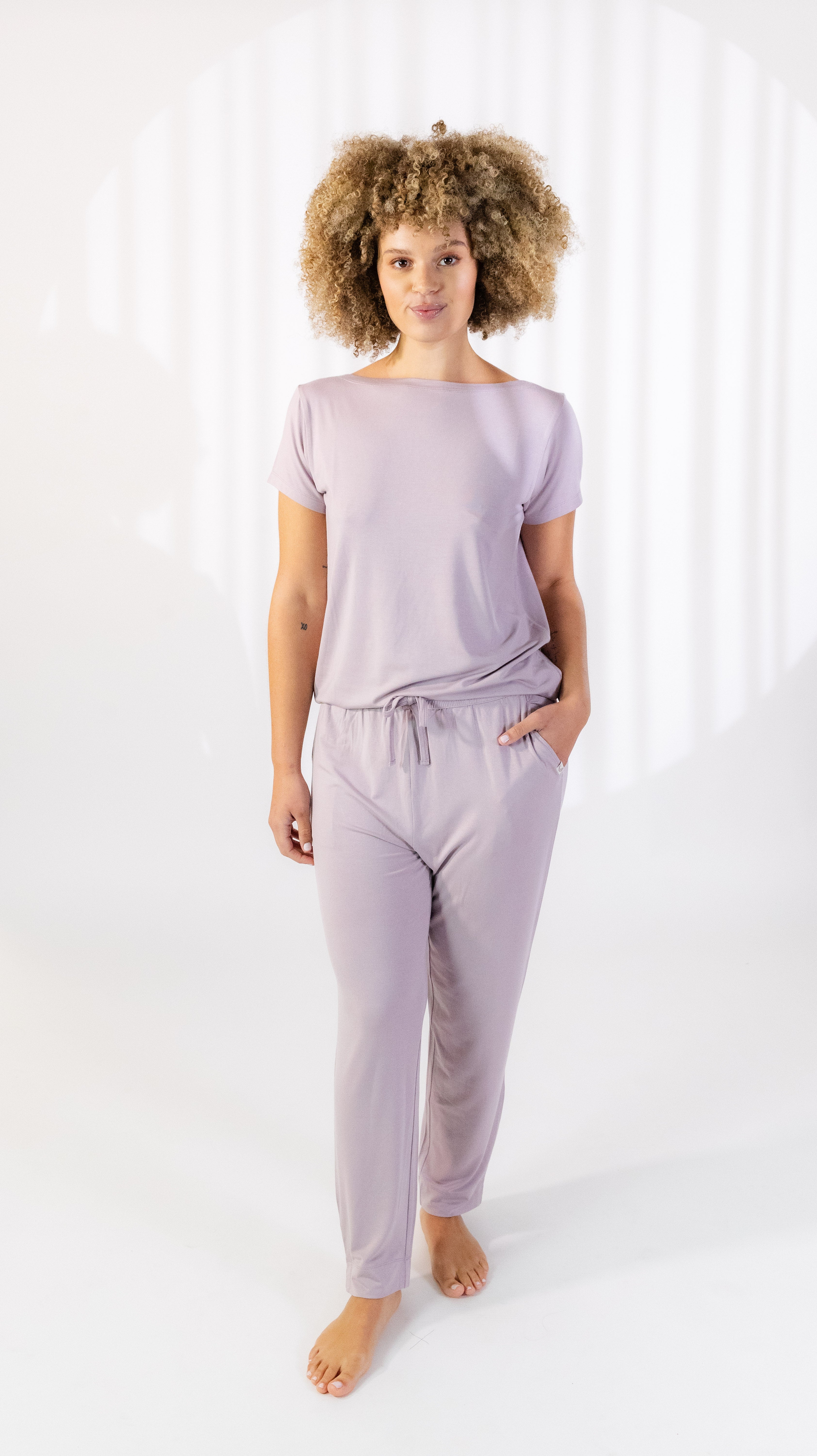 Our women's loungewear tapered long pants are designed to offer both comfort and style for your everyday relaxation. These pants are made from modal with a waistband and pockets, adding functionality to your loungewear collection. The tapered silhouette of these pants creates a modern and flattering look. They are designed to provide a comfortable fit around the waist and hips, gradually narrowing down towards the ankles. This design not only enhances your overall appearance but also allows for ease of movement. Featuring a one-and-a-half-inch waistband, with drawstring, these pants offer an adjustable fit to suit your preference. The waistband, with drawstring ensures a secure and comfortable hold, preventing any discomfort or slippage while you go about your day. Whether you are lounging at home or running errands, these pants will keep you feeling relaxed and supported.