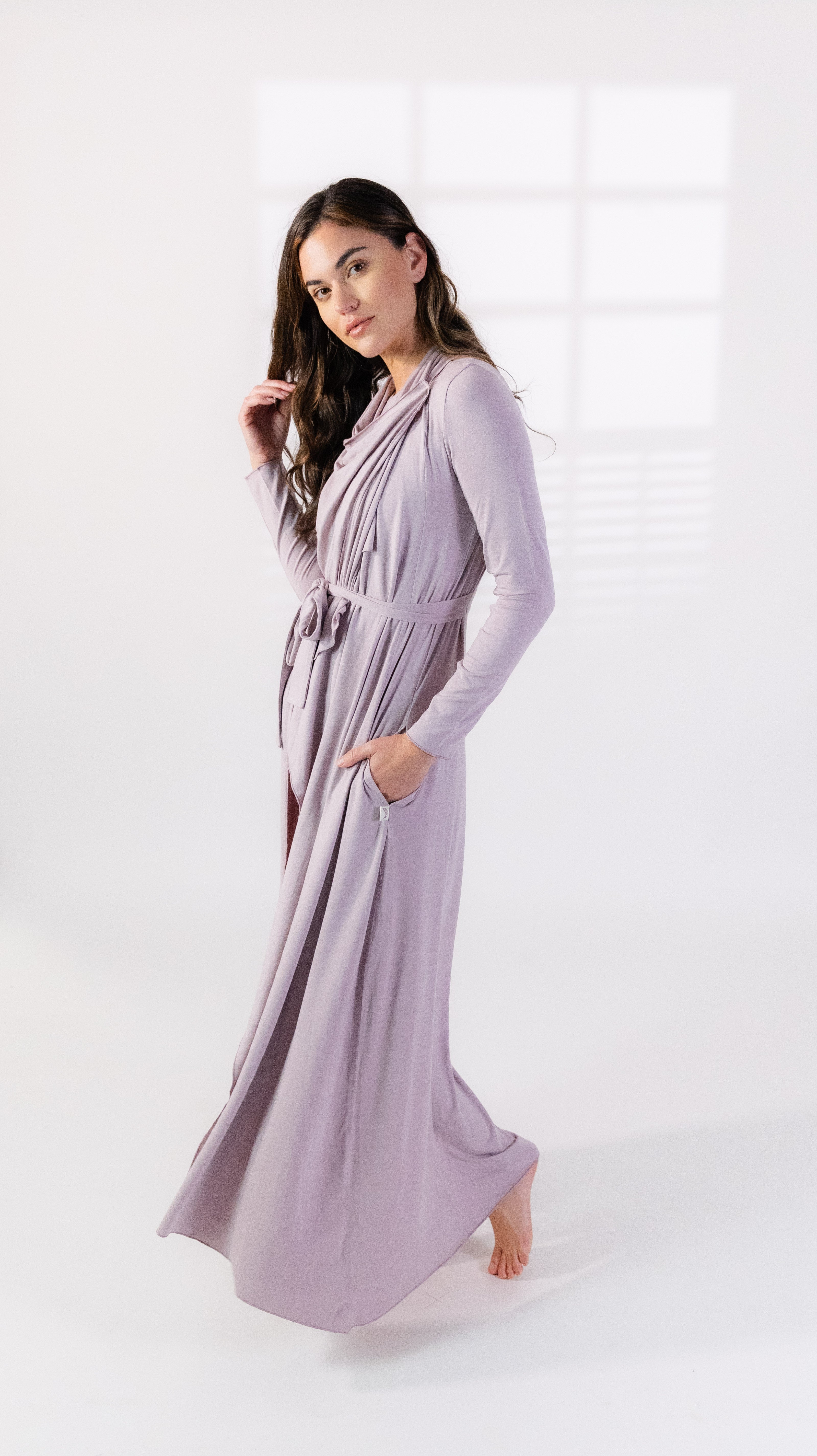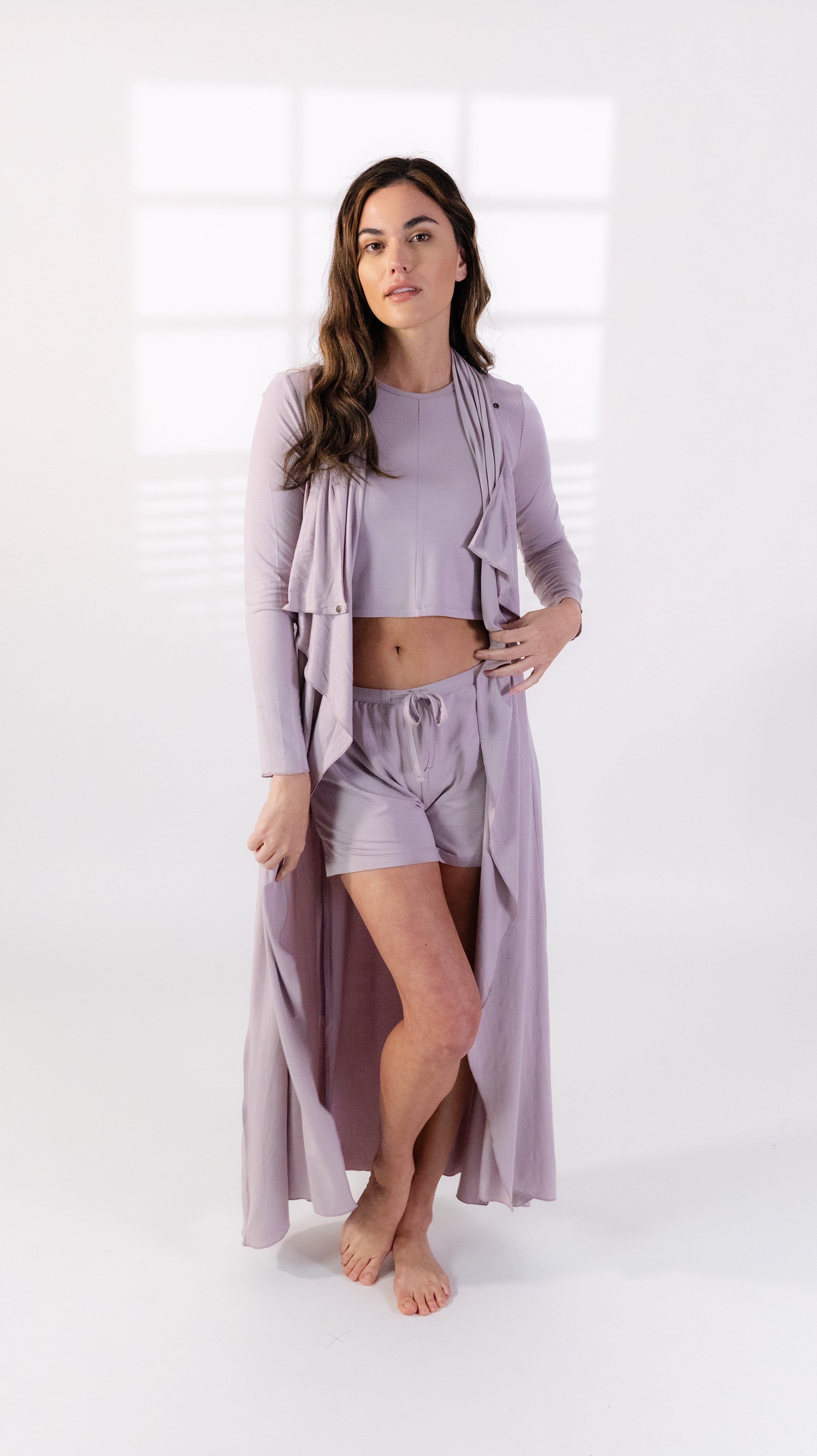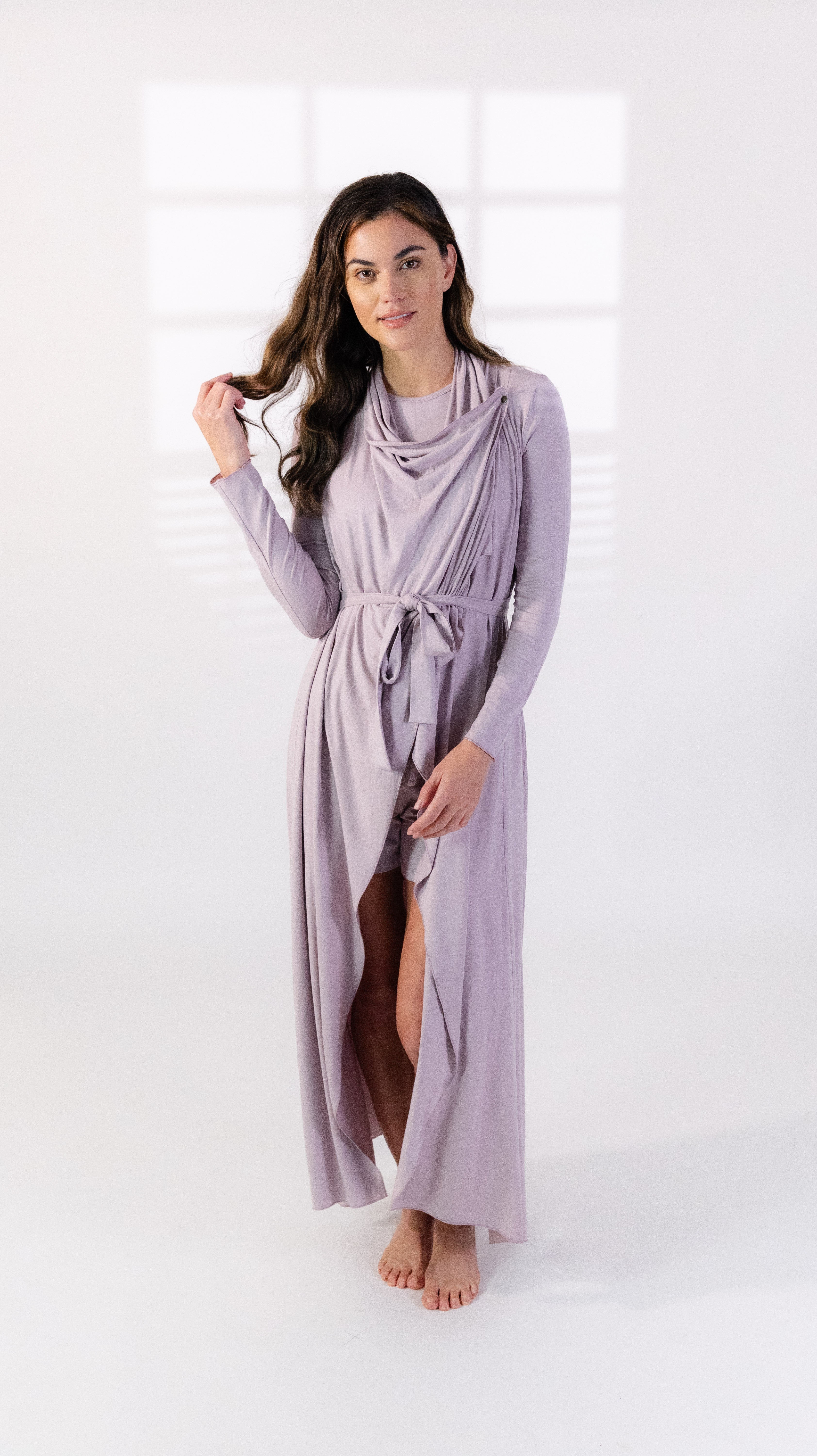 Luxuriate in comfort and elegance with our long drape robe. This exquisite robe is crafted from modal, a soft and lightweight fabric known for its breathability and silky texture. Designed specifically for women's loungewear, this robe features a long length that drapes beautifully, providing a sophisticated and flattering silhouette. The french hem adds a touch of elegance and refinement to the overall design. Modal fabric is not only incredibly soft against the skin but also has excellent moisture-wicking properties, ensuring you stay cool and dry throughout the day. It is the perfect choice for lounging at home or even as a stylish cover-up for a spa day or poolside relaxation. With its versatile design, this robe can be worn for various occasions. Whether you are enjoying a lazy morning at home, getting ready for a special event, or simply indulging in some self-care, this robe will make you feel pampered and stylish.