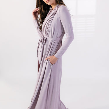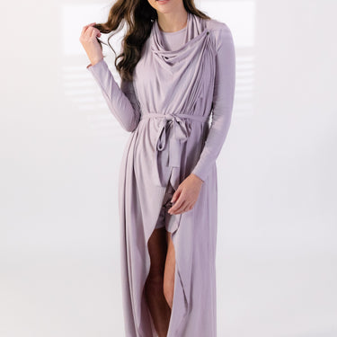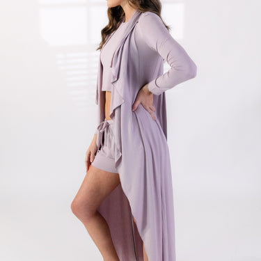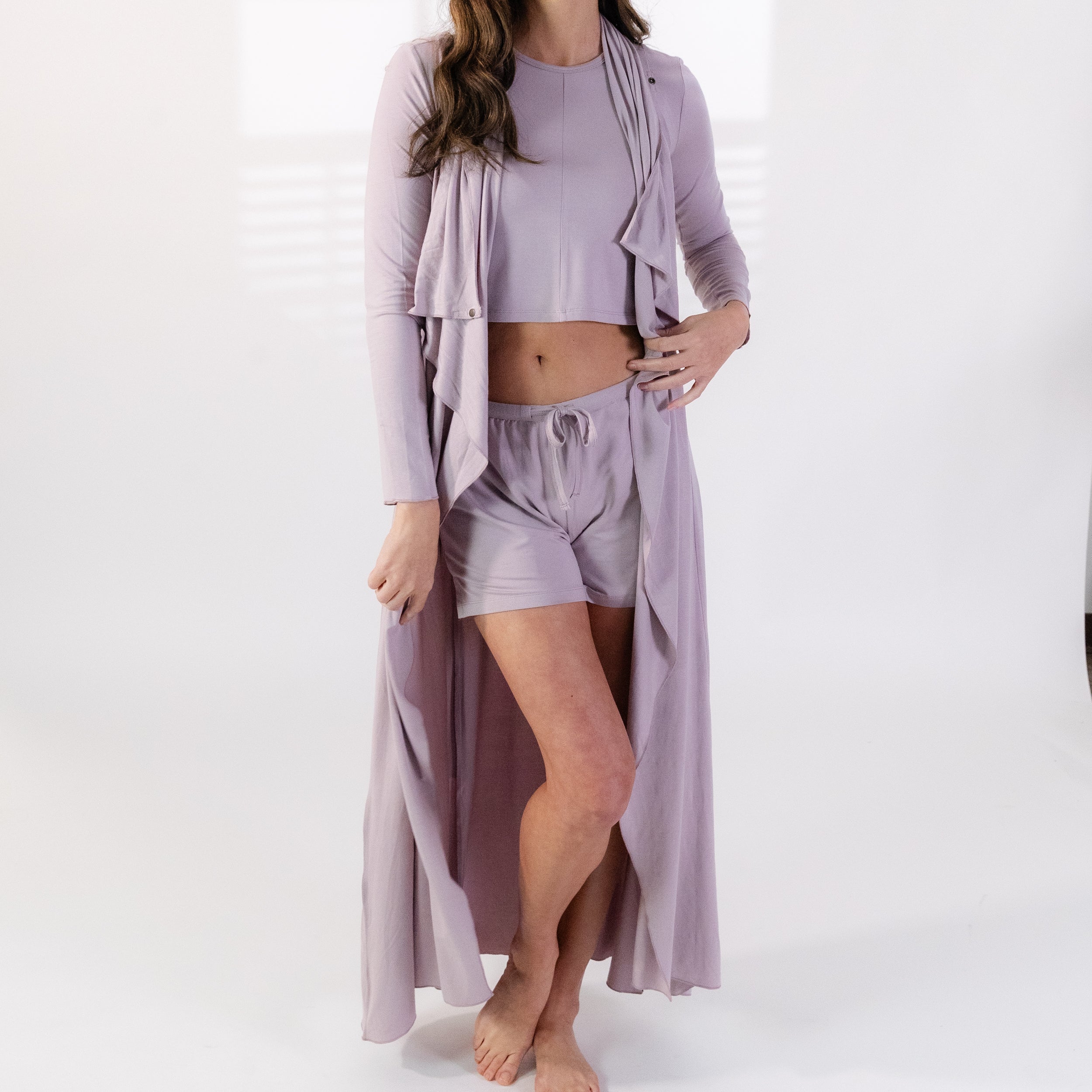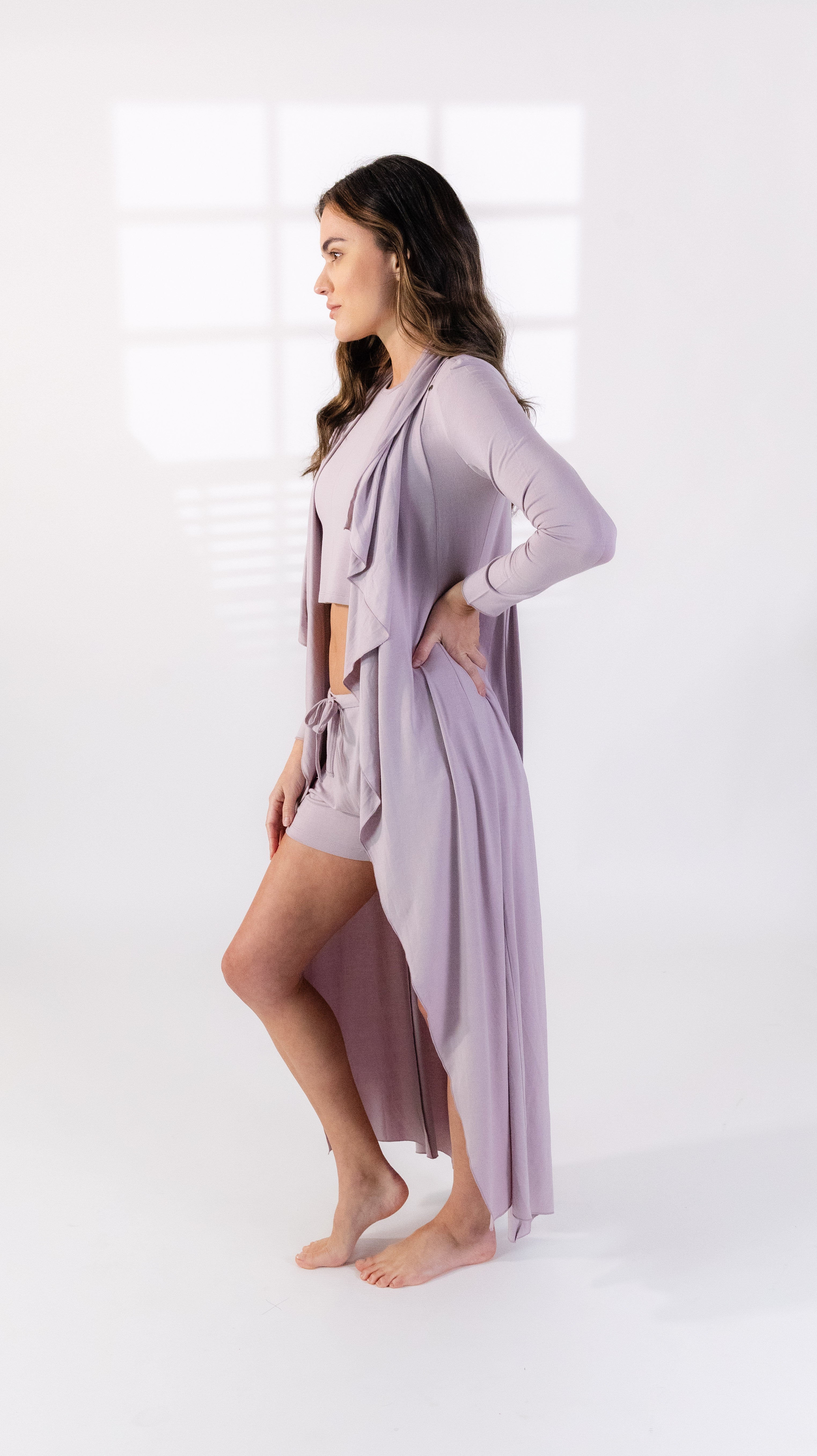 Luxuriate in comfort and elegance with our long drape robe. This exquisite robe is crafted from modal, a soft and lightweight fabric known for its breathability and silky texture. Designed specifically for women's loungewear, this robe features a long length that drapes beautifully, providing a sophisticated and flattering silhouette. The french hem adds a touch of elegance and refinement to the overall design. Modal fabric is not only incredibly soft against the skin but also has excellent moisture-wicking properties, ensuring you stay cool and dry throughout the day. It is the perfect choice for lounging at home or even as a stylish cover-up for a spa day or poolside relaxation. With its versatile design, this robe can be worn for various occasions. Whether you are enjoying a lazy morning at home, getting ready for a special event, or simply indulging in some self-care, this robe will make you feel pampered and stylish.